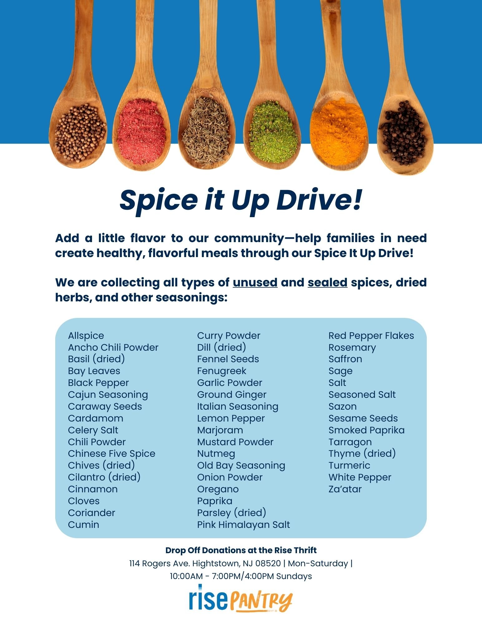Get Involved Today! Sign up to host a Spice It Up Spice Drive and rally your community to make a difference. For any questions or support, contact us at volunteer@njrise.org